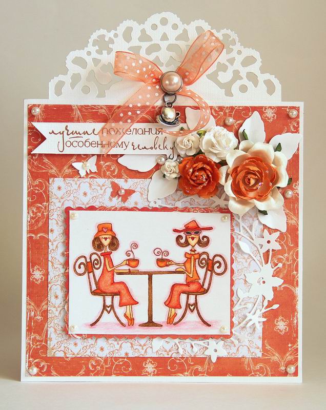 Основа - крафткартон. Штамп Kraftin Kimmie раскрашен Copic, 2 фоновых штампа на чайную тему, ленточки, цветы, кофейные стразы и гипсовый чайничек от MF.